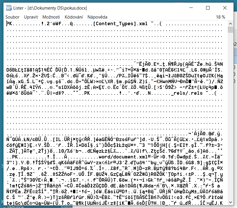 Byl vytvořen programem MS Word? Když přejmenujete příponu na ZIP, lze normálně se přílohami ZIPu pracovat? Vypadá začátek toho docx souboru podobně jako přiložený obrázek?