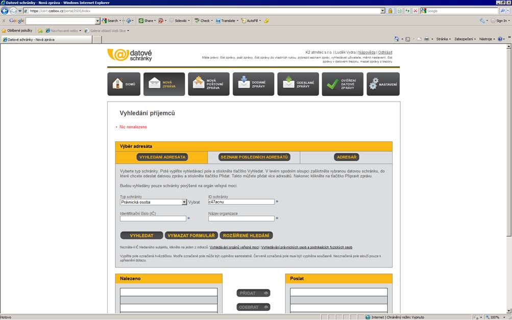 admin 23.01.2017 08:59 Attachments: DatoveSchranky.jpgV příloze zasílám printscreen kde vyhledávám datovou schránku.